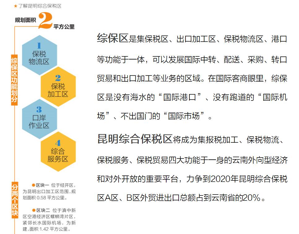 昆明將利用綜合保稅區(qū)這一特有的功能政策優(yōu)勢,積極與世界“對話”,積極聯(lián)通國內(nèi)國外“兩個市場”和“兩種資源”,集聚各類高端生產(chǎn)要素,把昆明打造成為面向西南開放的區(qū)域性國際貿(mào)易中心、物流樞紐中心、金融中心、信息中心、總部聚集中心、旅游文化中心和開放平臺,進一步增強昆明面向南亞東南亞的影響力、輻射力、帶動力。